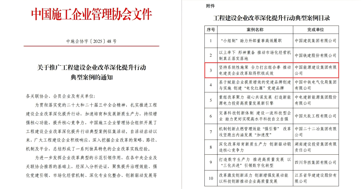news7月16日至18日,中國施工企業(yè)管理協(xié)會(huì)在江蘇省揚(yáng)州市召開第六屆工程建設(shè)行業(yè)企業(yè)家智會(huì),會(huì)上發(fā)布了10項(xiàng)代表性突出、創(chuàng)新亮點(diǎn)顯著、推廣價(jià)值高的“2025年工程建設(shè)企業(yè)改革深化提升行動(dòng)典型案例”,中國能建選送的《堅(jiān)持系統(tǒng)性施策 全力打出組合拳 推動(dòng)電建類企業(yè)改革取得積極成效》成功入選。